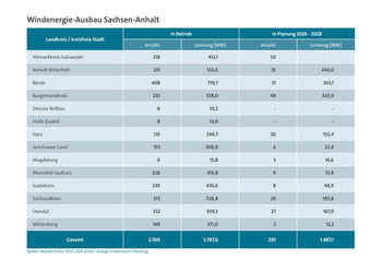 Besonders viele neue Windräder sind zwischen 2026 und 2028 aktuell im Landkreis Börde (51), im Altmarkkreis Salzwedel (50) und im Burgenlandkreis (49) geplant. Derzeit drehen sich die meisten Anlagen im Landkreis Börde (408), im Salzlandkreis (373) und im Landkreis Stendal (352). Auch bei der installierten Leistung haben diese Regionen die Nase vorn: Hier liegt der Landkreis Stendal (959,5 MW) auf Platz 1, gefolgt vom Salzlandkreis (728,8 MW) und dem Landkreis Börde (719,7 MW).