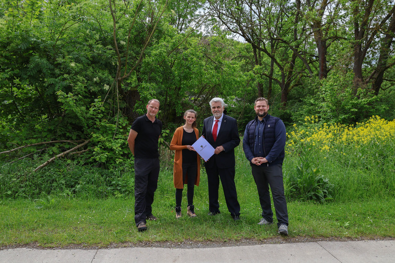 Startschuss mit Förderung: Zum offiziellen Auftakt für die naturnahe Sanierung der „Rosstränke“ bei Steigra (Saalekreis) hat Umweltminister Prof. Dr. Armin Willingmann heute den Zuwendungsbescheid über rund 209.000 Euro an den Geschäftsführer des Geo-Naturparks Saale-Unstrut-Triasland, Dr. Matthias Henniger, überreicht. Der am „Natura 2000“-Schutzgebiet „Trockenhänge bei Steigra“ gelegene Teich soll bis Ende September grundhaft saniert werden, um ihn als Lebensraum und Laichhabitat für geschützte heimische Amphibienarten wie Kammmolch, Laubfrosch oder Kleiner Wasserfrosch zu stärken sowie als ganzjährigen Wasserspeicher zu erhalten.