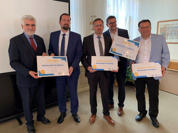 Die Hansestadt Havelberg wurde im April von der Agentur für Erneuerbare Energien (AEE) als "Energie-Kommune des Monats" ausgezeichnet. Am Montag, den 7. Juli 2025, haben Sachsen-Anhalts Energieminister Prof. Dr. Armin Willingmann, AEE-Geschäftsführer Robert Brandt und LENA-Geschäftsführer Marko Mühlstein Schilder und Urkunden an Bürgermeister Mathias Bölt und Stadtwerke-Geschäftsführer Sebastian Horn übergeben und die Hansestadt damit offiziell ausgezeichnet.