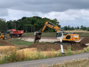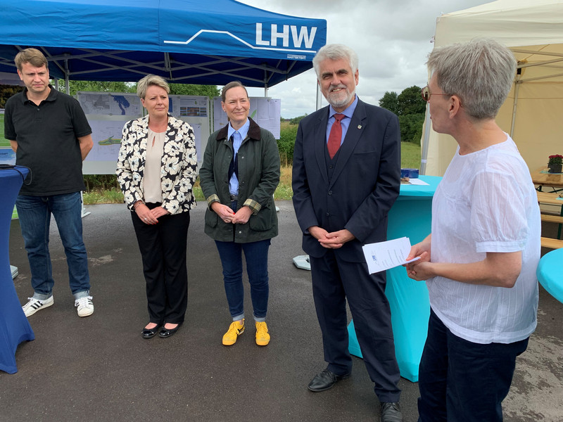 LHW-Direktorin Große-Sudhues bedankte sich nicht nur bei ihrem Team für die zielstrebige Umsetzung der Planungs- und Genehmigungsverfahren, die einer solchen Maßnahme vorausgehen, sondern auch bei den ausführenden Planungs- und Baufirmen für die gute Zusammenarbeit mit fristgemäßer Ausführung und kompetenter Umsetzung. Sie verwies darauf, dass für Deichkern, Stützkörper, Dichtung und Oberboden rund 51.000 Kubikmeter Material verbaut wurden. Auf ca. 19.000 Quadratmetern wurde Saatgut ausgebracht, Wegebau fand auf einer Fläche von insgesamt 5.880 Quadratmetern statt.