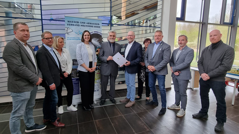 Über einen Zuwendungsbescheid kann sich jetzt auch der Wasser- und Abwasserverband Holtemme-Bode (WAHB) freuen: Geschäftsführer Nikolai Witte nahm die Förderzusage über 6,5 Millionen Euro aus dem Europäischen Fonds für regionale Entwicklung (EFRE) heute von Energieminister Prof. Dr. Armin Willingmann entgegen.