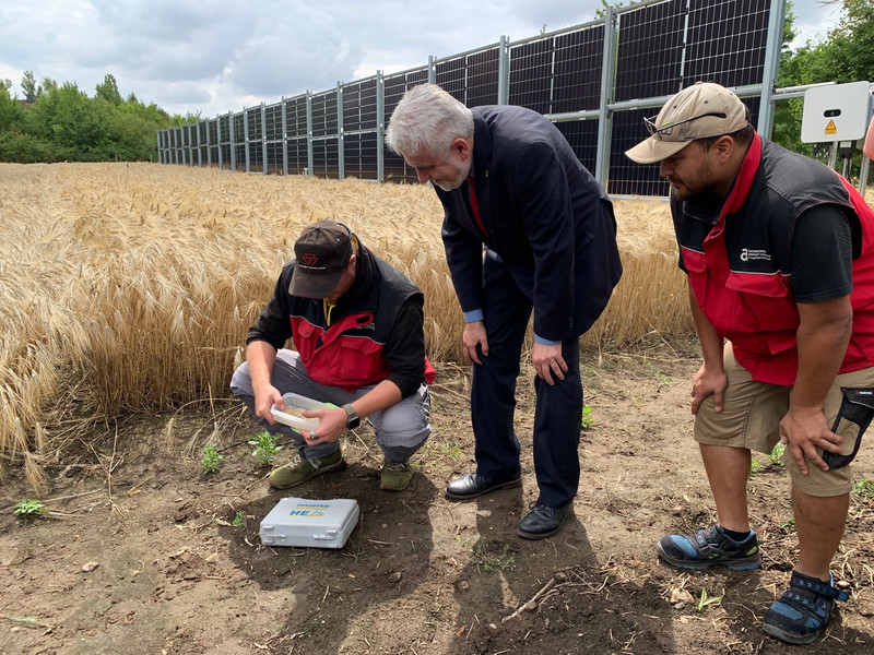 In Sachsen-Anhalt sind Flächen für Landwirtschaft, Industrie und erneuerbare Energien begehrt. Um Nutzungskonflikte zwischen Erneuerbaren und Landwirtschaft zu vermeiden, könnte in den kommenden Jahren verstärkt Agri-Photovoltaik zum Einsatz kommen. Es geht dabei um Photovoltaikanlagen, die so auf einer Ackerfläche montiert werden, dass auch landwirtschaftliche Nutzung möglich bleibt. Mit finanzieller Unterstützung des Energieministeriums hat ein Team der Hochschule Anhalt nun Methoden entwickelt, mit denen sich Vorrangflächen und Potenziale für Freiflächen- und Agri-Photovoltaik-Anlagen besser bestimmen lassen. Am heutigen Freitag hat sich Energieminister Prof. Dr. Armin Willingmann im Rahmen seiner Sommertour auf dem Campus in Bernburg über die Untersuchungsergebnisse informiert.