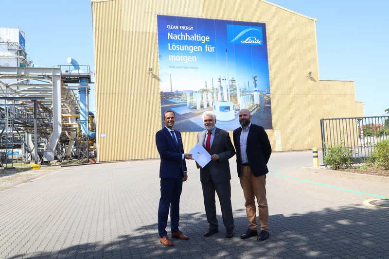 Baustein für den Aufbau einer klimafreundlichen Wasserstoffwirtschaft in Sachsen-Anhalt: Der Gasekonzern Linde plant in Leuna (Saalekreis) die Errichtung eines weiteren Elektrolyseurs zur Erzeugung von grünem Wasserstoff. Zusätzlich zur bereits bestehenden 24-Megawatt-Anlage soll voraussichtlich bis Ende 2026 ein weiterer Elektrolyseur mit einer Anschlussleistung von 5 Megawatt entstehen. Die Investition wird vom Energieministerium unterstützt; den entsprechenden Förderbescheid über knapp 4,3 Millionen Euro hat Minister Prof. Dr. Armin Willingmann heute in Leuna an den Vertriebsleiter der Business Unit Germany North bei Linde, Joachim Heider, überreicht.