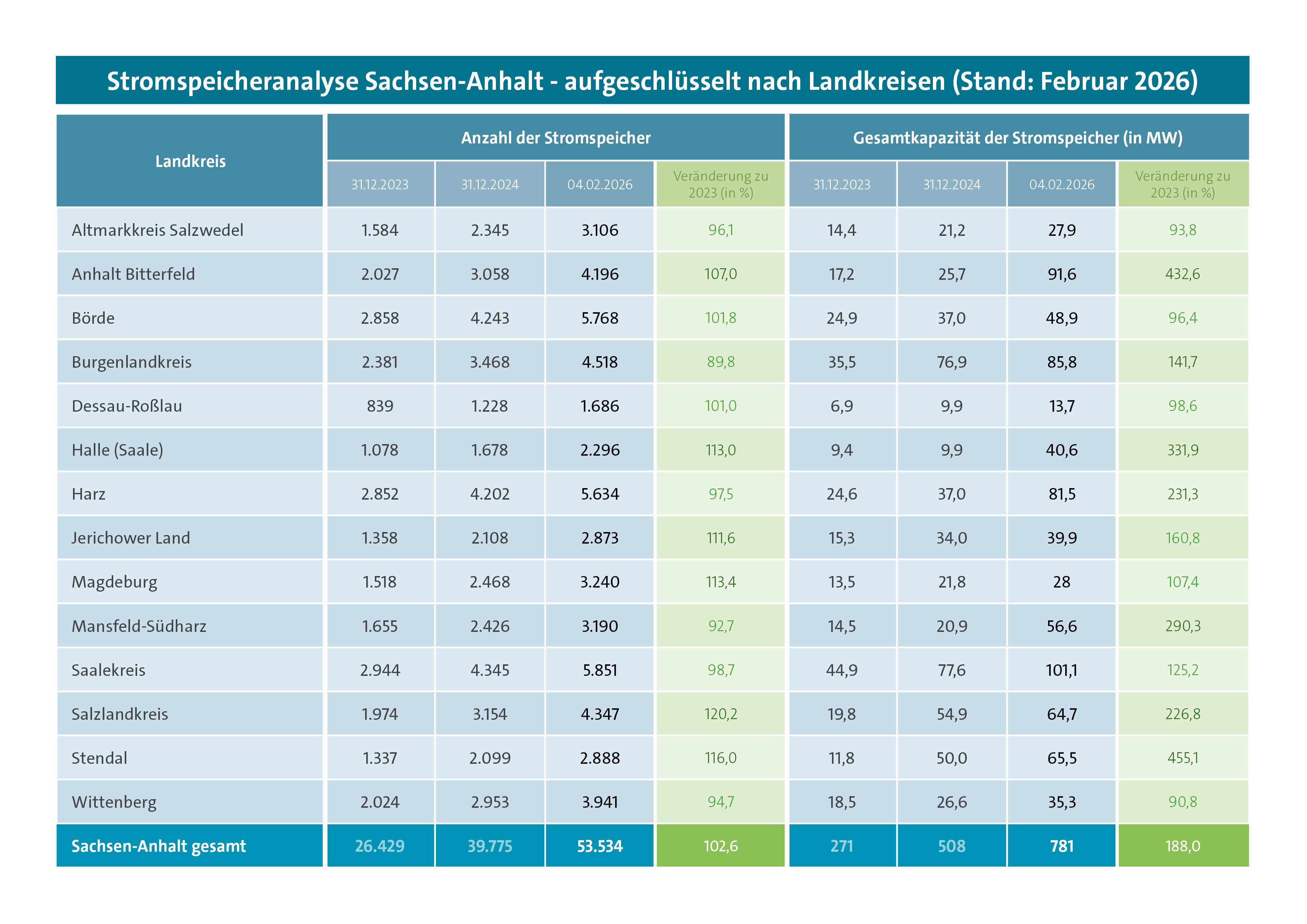 53.112 der insgesamt 53.534 Speicher entfallen auf die Kategorie Heimspeicher, was knapp 99,2 Prozent der Anzahl nach entspricht. Ihre nutzbare Speicherkapazität beträgt zusammengenommen 434 Megawattstunden (MWh), was etwa 55,6 Prozent der Gesamtspeicherkapazität aller in Betrieb befindlichen Speicher entspricht. Auch wenn die durchschnittliche Kapazität je Anlage gering ist – sie liegt bei etwa 8,18 Kilowattstunden (kWh) pro Speicher – machen Heimspeicher aufgrund ihrer hohen Zahl einen bedeutenden Teil der installierten Gesamtkapazität aus. Vorreiter hinsichtlich der Anzahl ist der Saalekreis mit 5.821 Heimspeichern und einer Gesamtkapazität von 46,9 MWh, gefolgt vom Landkreis Börde mit 5.729 Heimspeichern (46,7 MWh) und dem Landkreis Harz mit 5.563 Heimspeichern (45,4 MWh).
