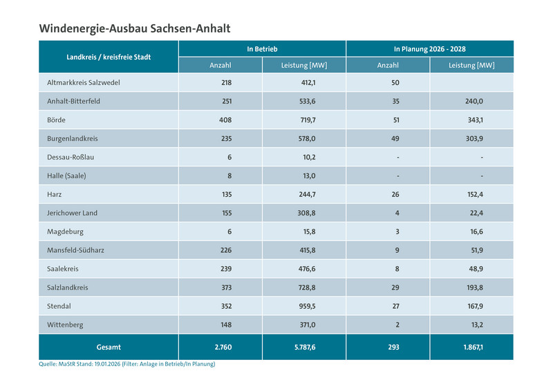 Besonders viele neue Windräder sind zwischen 2026 und 2028 aktuell im Landkreis Börde (51), im Altmarkkreis Salzwedel (50) und im Burgenlandkreis (49) geplant. Derzeit drehen sich die meisten Anlagen im Landkreis Börde (408), im Salzlandkreis (373) und im Landkreis Stendal (352). Auch bei der installierten Leistung haben diese Regionen die Nase vorn: Hier liegt der Landkreis Stendal (959,5 MW) auf Platz 1, gefolgt vom Salzlandkreis (728,8 MW) und dem Landkreis Börde (719,7 MW).