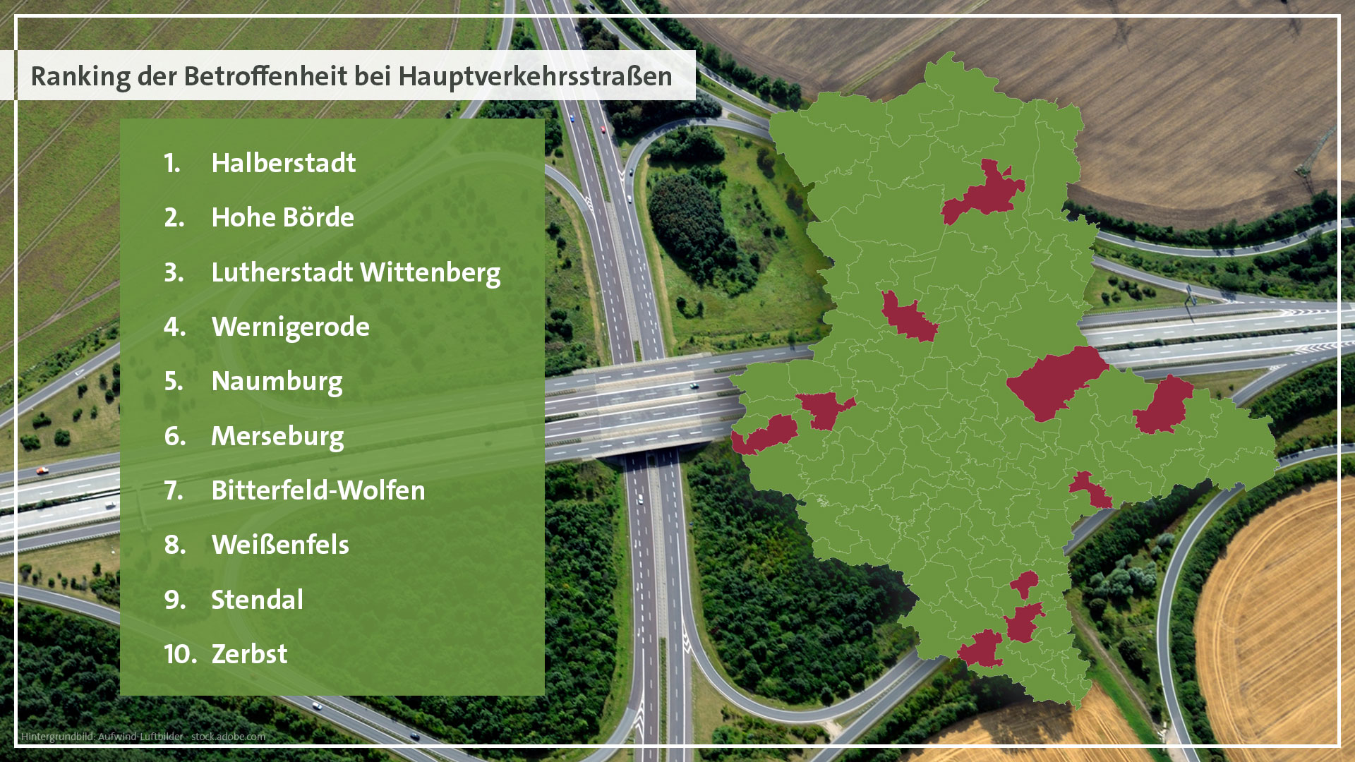 Die Lärmbelastung an Hauptverkehrsstraßen (mindestens 8.200 Fahrzeuge pro Tag), Haupteisenbahnstrecken (30.000 Züge pro Jahr) und Großflughäfen (50.000 Flugbewegungen pro Jahr) wird seit 2007 systematisch erhoben. Diese Lärmkartierung erfolgt auch in Sachsen-Anhalt alle fünf Jahre; die aktuellen Ergebnisse stammen daher aus dem Jahr 2022. Dabei können aber keine generellen Aussagen zur Entwicklung der Lärmbeeinträchtigungen für das gesamte Bundesland getroffen werden. Vielmehr muss man sich die entsprechenden Regionen genauer anschauen.