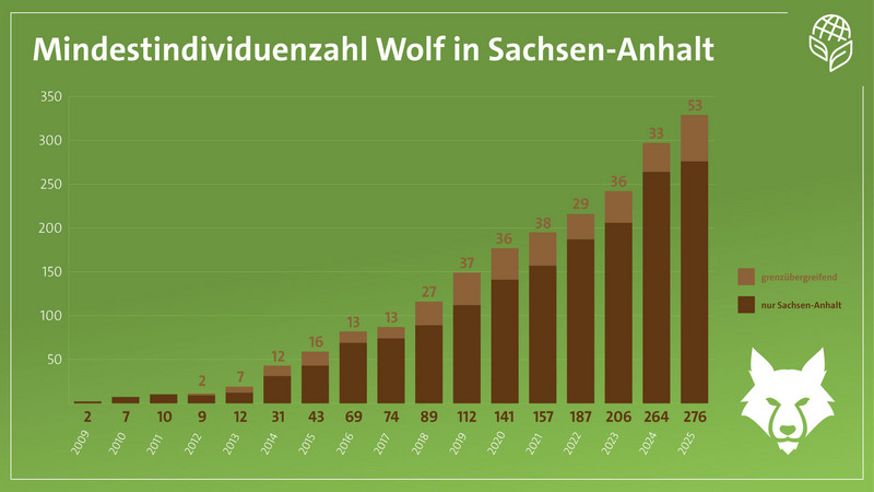 Der Wolf breitet sich in Sachsen-Anhalt weiter aus, seine Population wächst allerdings nur noch moderat an. Die Zahl der Territorien liegt im Monitoringjahr 2024/25 bei 38, ein Territorium mehr als im Vorjahr. Es gibt 31 Rudel, fünf Wolfspaare und zwei territoriale Einzeltiere.